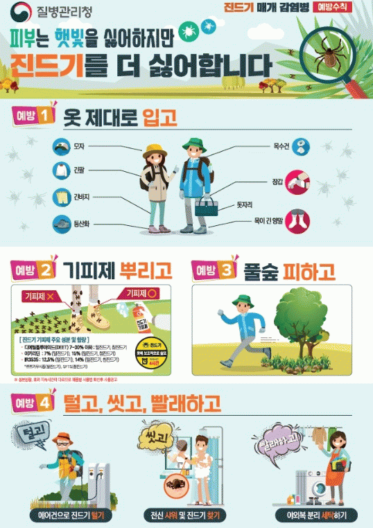 진드기 매개 감염병을 예방하기 위해서는 ▲피부 노출 최소화 ▲기피제 뿌리기 ▲풀숲 피하기 ▲야외활동 후 전신 샤워하기 ▲야외복 분리 세탁하기 등 예방수칙을 준수해야 한다.