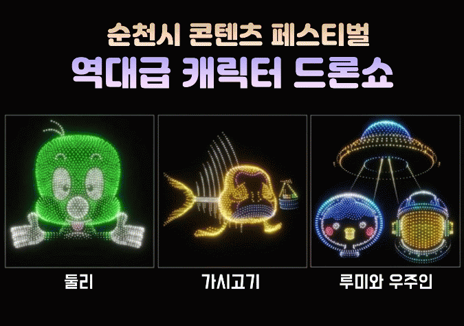 순천에서 최초로 선보이는 이번 드론쇼는 ▲아기공룡 둘리 ▲공포의 외인구단(떠돌이 까치) ▲월리를 찾아라 등 다양한 캐릭터들로 오천그린광장 상공을 메운다고 해 벌써부터 시민들의 이목이 집중되고 있다.