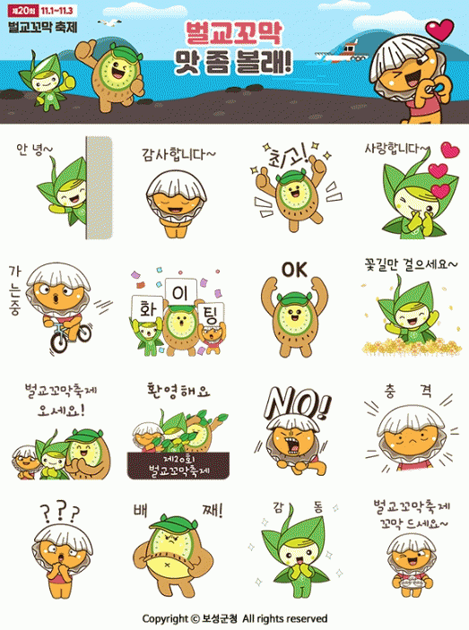 군 관계자는 “11월 1일부터 3일까지 열리는 벌교꼬막축제를 응원하기 위해 준비한 BS삼총사 이모티콘도 받으시고 다양한 프로그램이 마련된 축제를 찾아 즐기시길 바란다”라고 말했다.