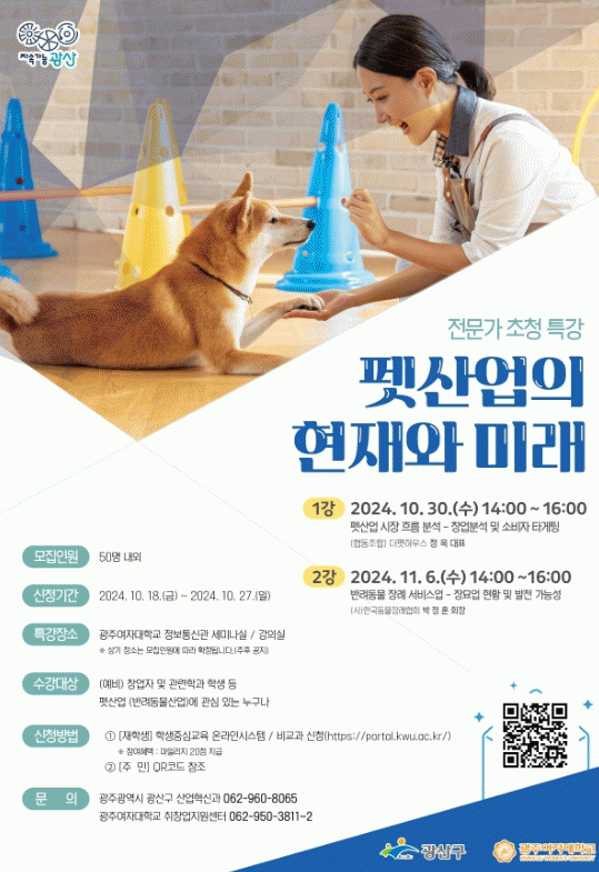 광주 광산구(구청장 박병규)가 30일과 11월 6일 이틀간 광주여자대학교에서 ‘펫산업의 현재와 미래’ 특강을 진행한다.