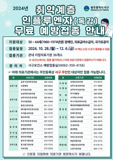 서구는 오는 28일부터 12월 6일까지 50~64세(1960~1974년 출생) 장애인, 국가유공자, 의료급여수급권자를 대상으로 인플루엔자 불활성화 4가 백신을 무료로 지원할 계획이다.