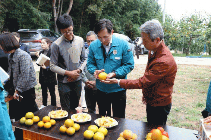 우승희 영암군수는 박 씨와 올해 햇볕데임 피해로 인한 어려움을 이야기하고, 그 해법과 고품질 단감 재배 방법 등에 대해 논의했다.