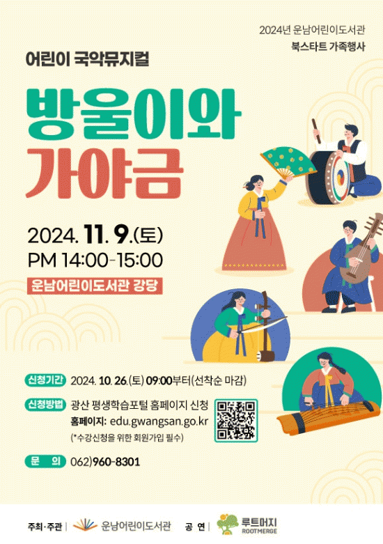 지역 공연단체 루트머지(주)가 가야금과 장구의 흥겨운 가락을 즐기고 민요를 따라 부를 수 있는 국악극을 펼친다.