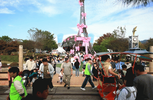 기차마을 주요 경관인 에펠탑과 중앙광장 돔, 중앙무대를 리본, 선물상자 등으로 꾸며 축제장을 찾은 아이들이 선물을 받는 기분을 느낄 수 있도록 신경을 썼다.