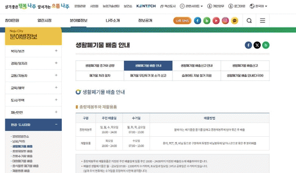 28일 나주시에 따르면 이번 누리집 개편을 통해 생활폐기물·대형폐기물·생활폐기물 신고 등 안내 메뉴를 기존 3개 항목에서 9개 항목으로 세분화했다.