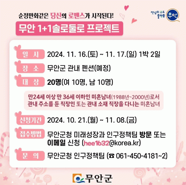 이번 프로젝트는 특히, 무안군이 주최하는 첫 로맨스 이벤트로 참가비가 무료이며, 참가 신청은 **11월 8일**까지 가능하다.
