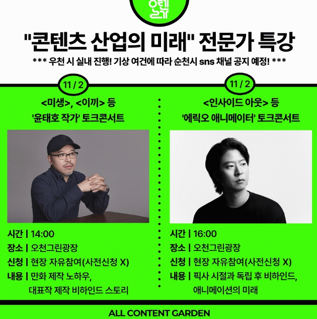 노관규 순천시장은 “잘 가꿔온 생태자원 위에 웹툰, 애니메이션 등 문화콘텐츠를 도시 곳곳에서 경험하고 느낄 수 있도록 이번 행사를 준비했다”며 “특히 예비 작가, 예비 애니메이터로서 순천에 오면 다양한 기회를 접하고, 배우고, 꿈을 키워갈 수 있도록 문화산업의 뿌리를 깊숙이 다지겠다”고 말했다.