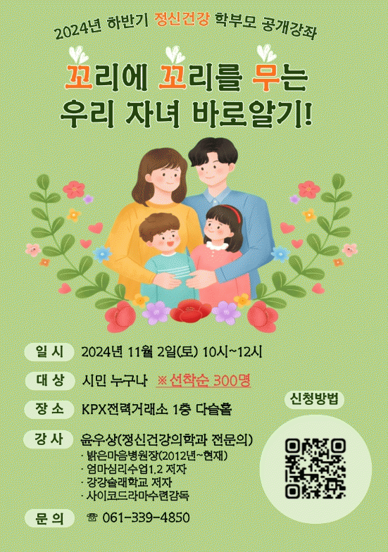 참가를 희망하는 학부모는 나주시정신건강복지센터 홈페이지에서 사전 신청할 수 있으며 QR코드를 통해서도 간편하게 신청할 수 있다. 접수는 11월 1일까지 선착순 300명으로 참가 비용은 무료이다.