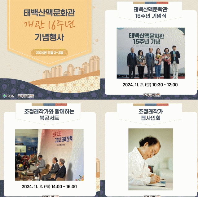 이날 기념행사에는 소설 태백산맥의 저자 조정래 작가와 함께하는 태백산맥문학관 개관 16주년 기념식과 북콘서트가 진행된다.