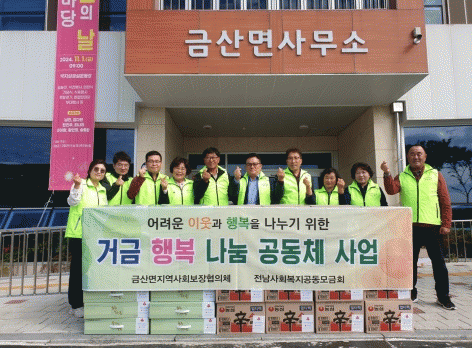 한편, 금산면 지역사회보장협의체는 좀도리 특화사업을 지속적으로 추진하며, 어르신부터 어린아이까지 금산면민을 따뜻하게 보살피는 다양한 지원 사업을 펼치고 있다. 협의체는 넉넉한 엄마의 품처럼 지역에 온기를 불어넣고, 누구나 살고 싶고 머물고 싶은 정이 넘치는 금산면을 만들기 위해 최선을 다하겠다고 밝혔다.