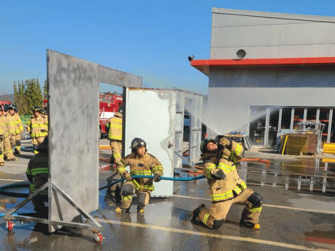 이번 교육과정에서는 펄싱, 페인팅, 펜슬링 등 3가지 관창 조작기술을 활용하는 3D주수기법을 이용해 화재실 내부진입(Door Entry)훈련을 실시했다.