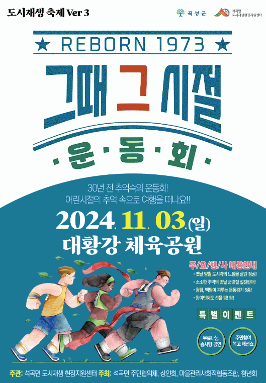석곡 도시재생 주민협의체, 청년회, 상인회, 석곡돌실 마을관리사회적협동조합이 주최하고 석곡면 도시재생현장지원센터가 주관하는 이번 축제는 석곡 주민 300여 명이 참석하여“그때 그 시절 Reborn_1973”이라는 주제로 1970년대 게임, 체험 프로그램, 도시재생 OX 퀴즈, 추억 속의 사진관, 복고패션쇼 등 추억의 운동회 프로그램이 진행될 예정이다.