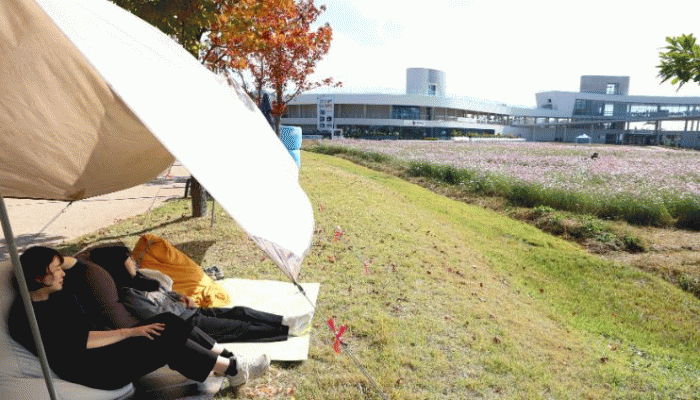 메인 행사장의 부스를 지나 오른편에 조성된 ‘힐링놀이터’는 하늘거리는 타프가 만들어내는 그늘 속 빈백에 누워 하염없이 ‘멍때리기’를 할 수 있는 공간과 누구나 이용할 수 있는 인디언 텐트를 조성해 여유를 더했으며, 통기타로 펼쳐지는 버스킹 공연과 함께 시선을 돌리면 대단지의 코스모스 꽃밭이 펼쳐져, 분주하고 활기찬 메인 행사장과는 확연히 구분되는 여유로운 분위기를 자아냈다.