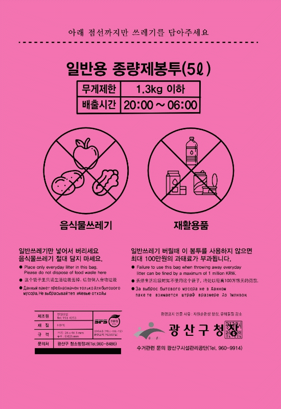 광산구 관계자는 “시민 누구나 종량제봉투만 보아도 배출 규정을 알 수 있도록 디자인을 개선했다”며 “시민의 올바른 분리배출 실천, 원활한 수거 환경 조성에 도움이 되길 기대한다”고 말했다.