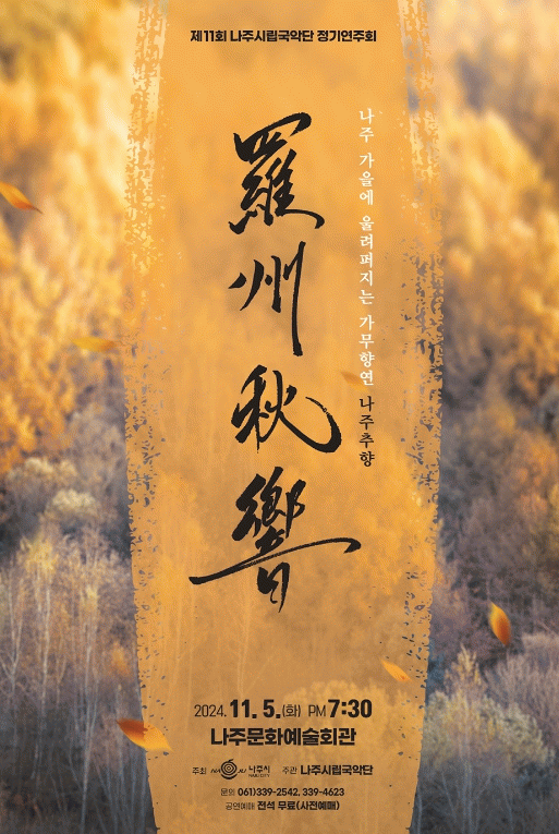 전라남도 나주시는 오는 11월 5일에 나주문화예술회관에서 나주시립국악단 제11회 정기연주회 '나주 가을에 울려 퍼지는 가무향연 羅州秋響(나주추향)’을 개최한다고 31일 밝혔다.