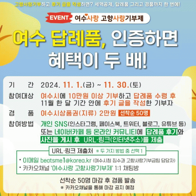 이번 행사는 여수시에 10만 원 이상 기부하고 답례품을 수령한 후 후기 글을 작성하면 선착순 50명에게 여수시상품권(지류) 2만 원을 지급하는 이벤트다.