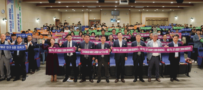 영암군 공직자들은 정례조회에서 ‘영암에 주소 갖기 캠페인 다함께 참여합시다’ 문구가 적힌 손 펼침막을 들고, 구호를 외치며 인구 지키기의 의지를 다졌다.