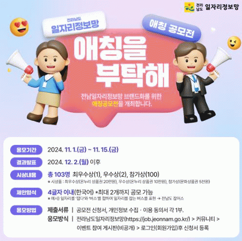 최우수로 선정된 애칭은 ‘전라남도 일자리정보망’과 병행 사용하고, 다양한 홍보자료에도 활용할 계획이다.