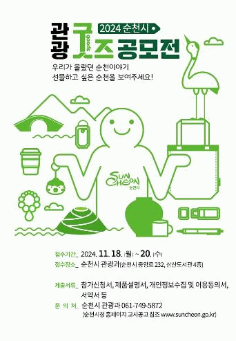 시 관계자는 “이번 공모전을 통해 선정된 굿즈는 순천 관광 홍보를 위해 활용할 예정”이며, “관광객들이 간직하고 선물할 만한 소품 위주의 실용적이고 독창적인 작품이 응모되기를 기대한다”고 말했다.