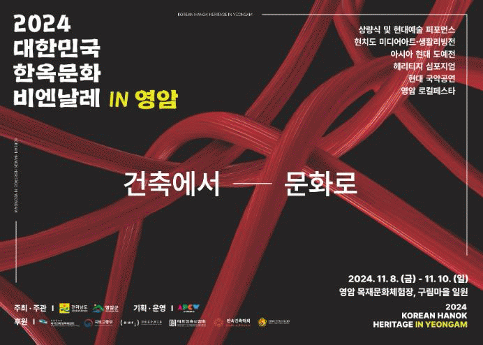영암군 11/8일부터 10일 영암목재문화체험장과 구림한옥마을 일대에서 ‘건축에서 문화로’를 주제로 ‘2024 대한민국 한옥문화비엔날레’를 개최한다.