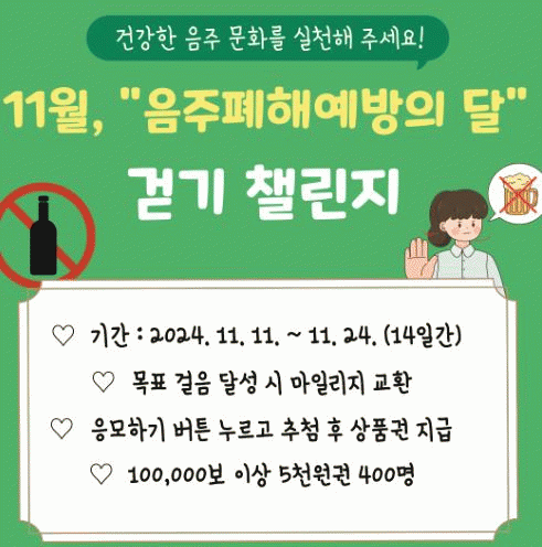 서영옥 건강증진과장은 “광양시는 워크온을 통해 시민들의 생활 속 걷기를 장려하고 있다”라며 “11월은 음주폐해예방의 달로 이번 챌린지를 통해 절주 문화가 확산되기를 바란다”라고 말했다.