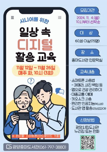 해당 교육에 관심이 있는 60세 이상의 광양시민은 도서관 누리집(홈페이지) 또는 전화로 신청하면 된다.