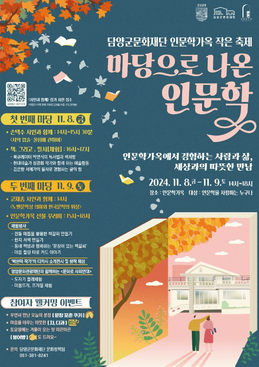 ‘마당으로 나온 인문학’ 축제에서는 손택수 시인과 함께 시에 관한 이야기를 나누고, 고재종 시인이 말하는 노벨문학상 의미와 한국문학의 위상을 주제로 토크콘서트가 진행된다.