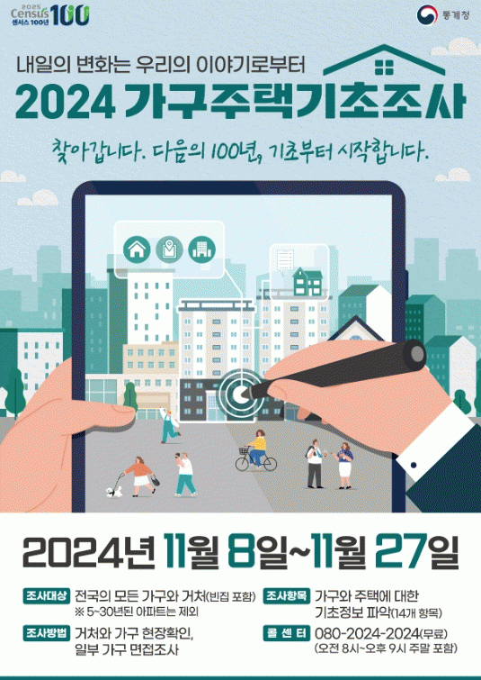 5년마다 전국을 대상으로 하는 가구주택기초조사는 내년 인구주택총조사와 농림어업총조사의 정확한 조사구 설정을 위해 전국의 모든 거처와 가구의 기초정보를 확인하는 조사로 통계청이 주관하고 지자체가 협력해 진행하는 대규모 국가통계 조사다.