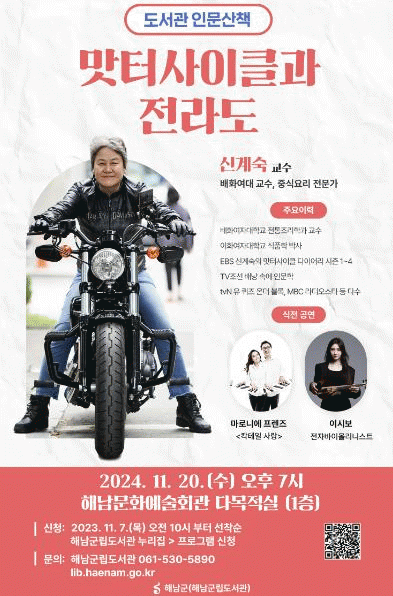 이번 행사에는 EBS '신계숙의 맛터사이클 다이어리'로 유명한 신계숙 교수가‘맛터사이클과 전라도'를 주제로 여행을 통해 직접 경험한 전라도의 맛에 대한 이야기를 들려줄 예정이다. 오늘 할 일을 내일로 미루지 않는 거침없는 도전정신과 인생스토리로 시청자들을 끌어들이는 신교수 특유의 화법으로, 참여자들과 함께 소통하는 자리가 될 것으로 기대된다.