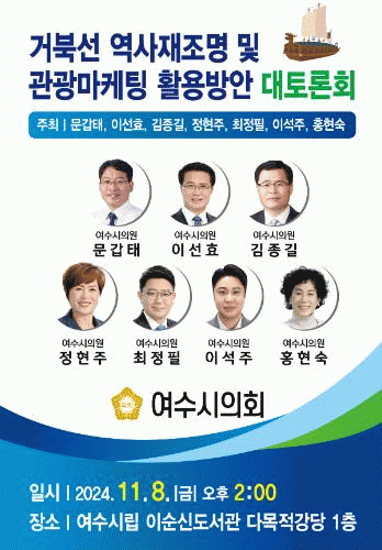 토론회를 공동 주최하는 의원들은 “여수지역의 거북선 관련 유적들이 재조명되어 지역의 정체성 확립, 시민들의 자긍심 고취와 관광소득 증대, 지역경제 활성화에 촉매 역할을 하길 기대한다”고 강조했다.