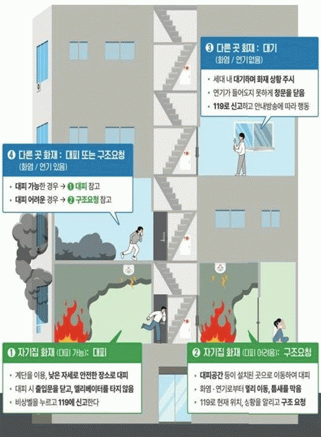 특히 아파트와 같은 공동주택은 세대 밀집도가 높아 화재 시 연기가 계단, 복도, 승강로 등으로 빠르게 확산될 위험이 커, 무리한 대피보다는 상황에 맞는 대응이 필요하다.