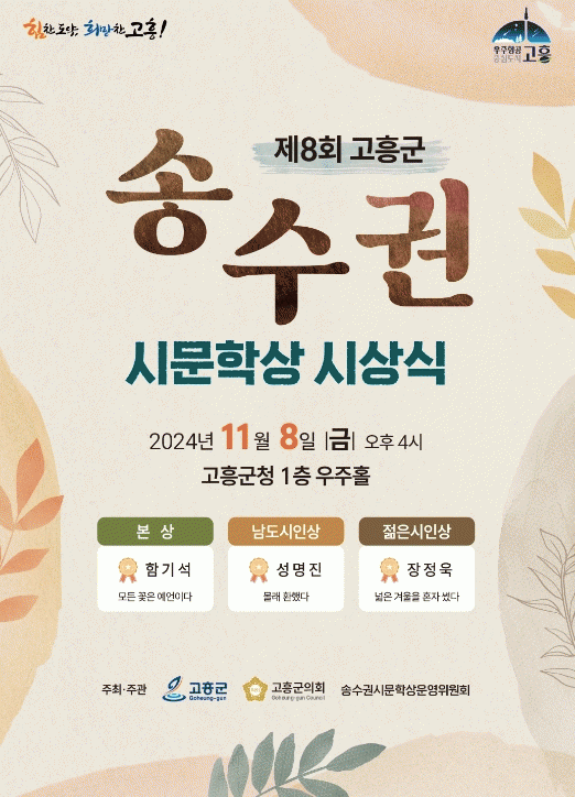 고흥군은 오는 11월 8일 오후 4시 고흥군청 우주홀에서 시상식을 개최할 예정이며, 본상 수상자에게 3천만 원, 올해의 남도시인상 수상자에게 1천만 원, 올해의 젊은 시인상에는 5백만 원의 상금이 수여될 예정이다.