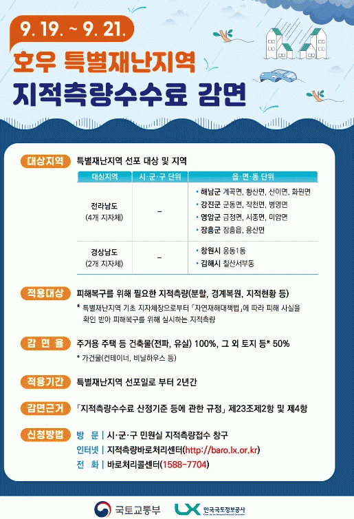 국토교통부 이번 지적측량 수수료 감면을 통해 호우 피해 주민들의 경제적 부담을 경감하고 신속한 피해복구를 돕기로 했다.