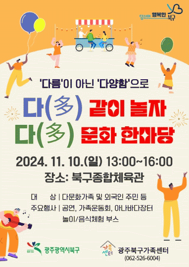 이외에도 ‘세계 전통음식 및 전통 놀이 체험 부스’, ‘북구가족센터 성과 전시회’, ‘아나바다 장터’ 등 참여자들이 직접 보고 즐길 수 있는 다양한 부대행사도 병행될 계획이다.