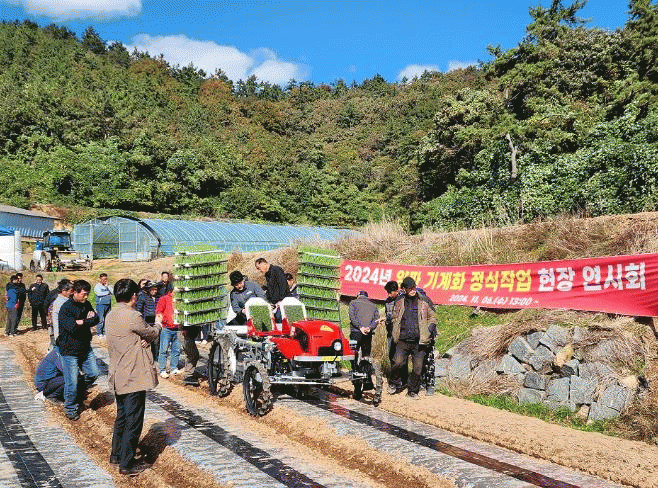 이날 연시회에서는 휴립복토기를 활용한 두둑 성형과 승용 정식기를 활용한 정식작업을 시연하여 양파 재배 농업인들에게 밭작물 기계화에 대한 확신을 심어주었다.
