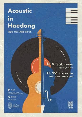 하반기 ‘어쿠스틱 인 해동’은 재즈를 주제로 11월 9일 오후 3시 재즈 밴드 프렐류드(Prelude), 11월 29일 오후 7시 30분 피아니스트 그룹 포맨스 피아노(4Men’s Piano)의 공연으로 준비될 예정이다.