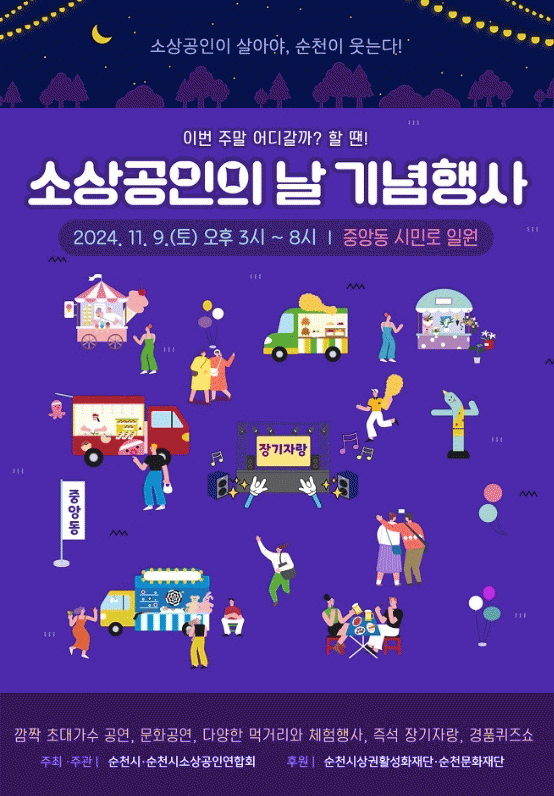이번 행사는 순천시소상공인연합회가 주관하고, 순천시상권활성화재단, 문화재단, 원도심상인연합회가 공동 후원하여 마련됐다. 원도심의 활기를 되찾고자 하는 각 단체와 소상공인들이 뜻을 모아 다양한 프로그램을 기획하며, 지역경제 활성화를 위한 의미 있는 축제로 자리매김할 예정이다.