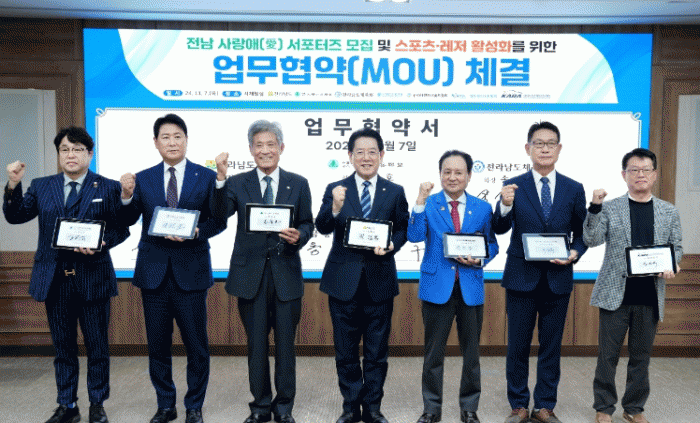 전남도와 6개 협회는 전남 사랑애 서포터즈 가입 등 고향사랑 실천과 도내 각종 스포츠·레저 대회 유치 및 홍보 협력 등 지역 경제 활성화와 도민 생활체육 증진을 위해 힘을 모으기로 다짐했다.