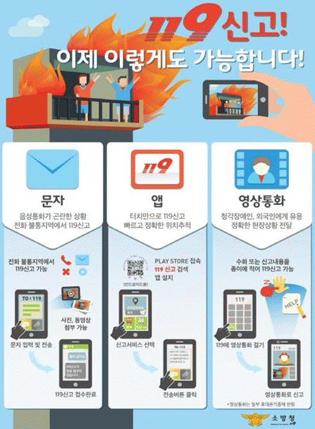 앱을 통한 신고 방법은 스마트폰에서 ‘119 신고’ 앱을 설치한 후 신고 서비스를 선택해 전송하면 되며, 이 경우 GPS 정보가 자동으로 119 상황실로 전송되어 정확한 위치 파악이 가능하다.