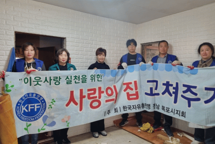 한국자유총연맹 목포시지회는 지속적으로 저소득 취약계층을 위한 집수리와 대청소 등 사랑의 집수리 봉사를 실천해오고 있어 주위의 미담과 희망이 되고 있다.