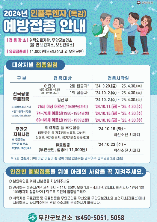 65세 이상 어르신(1959년생까지), 13세 이하 어린이(2011년생까지), 임신부는 주소지와 상관없이 전국의 가까운 지정의료기관이나 무안군보건소, 각 읍.면 보건지소, 보건진료소에 신분증을 갖고 방문하면 무료로 접종받을 수 있다.