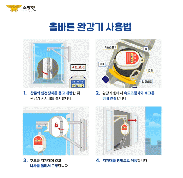 올바른 완강기 사용법 순서는 ①창문의 안전장치를 풀고 개방한 뒤 완강기 지지대를 설치 ②완강기 함에서 속도조절기와 후크를 꺼내 연결 ③후크를 지지대에 걸고 나사를 돌려서 고정 ④지지대를 창밖으로 이동 ⑤아래에 사람이 있는지 확인 후 릴(줄)을 밑으로 떨어뜨리기 ⑥안전벨트를 가슴 높이로 착용 후 고정링을 가슴쪽으로 꽉 당기기 ⑦하반신이 먼저 내려가게끔 창문 쪽에 걸터앉은 자세 취하기 ⑧벨트가 풀리지 않게 양팔을 쭉 뻗고 벽면을 짚으며 내려오기이다.