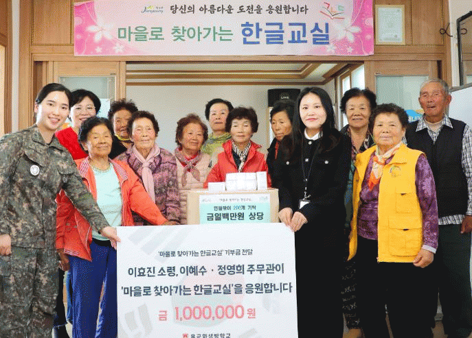 육군화생방학교 화생방학 교관 이효진 소령은 “어르신들이 한글을 배우며 세상과 소통하고, 손주에게 직접 손편지를 쓰는 꿈을 실현할 수 있기를 바란다”며 “작은 기부이지만 어르신들에게 희망이 되기를 바란다”고 소감을 밝혔다.