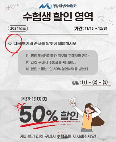 오늘 15일부터 다음달 31일까지 케이블카를 방문하여 발권 시 수험표를 제시하면 동반 1인까지 케이블카 반값 할인이 적용되며, 일반 캐빈 기준 7,500원 바닥이 투명한 크리스탈 캐빈은 9,000원에 이용이 가능하다.