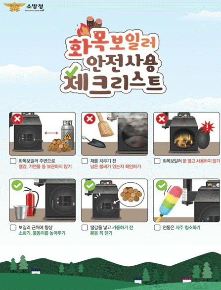 ▲보일러 주변에 땔감, 가연물 등을 보관하지 않기 ▲재를 치우기 전 불씨가 남아 있는지 확인하기 ▲보일러 문을 열고 사용하지 않기 ▲보일러 근처에 항상 소화기와 물통을 비치해 만일의 상황에 대비하기 ▲땔감을 넣고 가동하기 전 반드시 문을 닫기 ▲연통을 자주 청소하여 막힘을 방지하기 등이다.