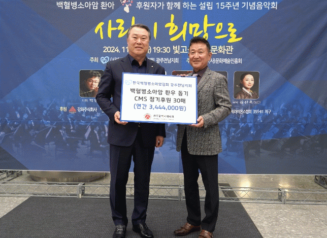 이번 전달식은 한국백혈병소아암협회 광주전남지회가 설립 15주년을 맞이하여 개최한 “사랑이 희망으로” 기념음악회에서 백혈병소아암 환아와 가족, 후원자들이 함께한 가운데 진행되어 더욱더 뜻깊은 행사가 됐다.