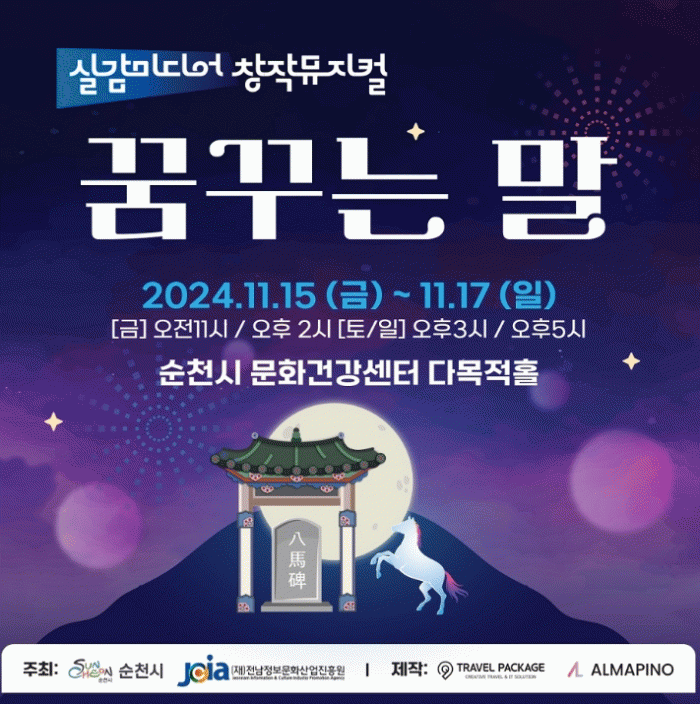 '꿈꾸는 말'은 순천의 대표정신인 팔마를 모티브로 하여 현시대를 살아가는 주인공 리효가 시공간을 넘어 과거로 시간여행을 하면서 최석을 만나 팔마의 가치를 깨닫는 아동을 위한 뮤지컬이다.