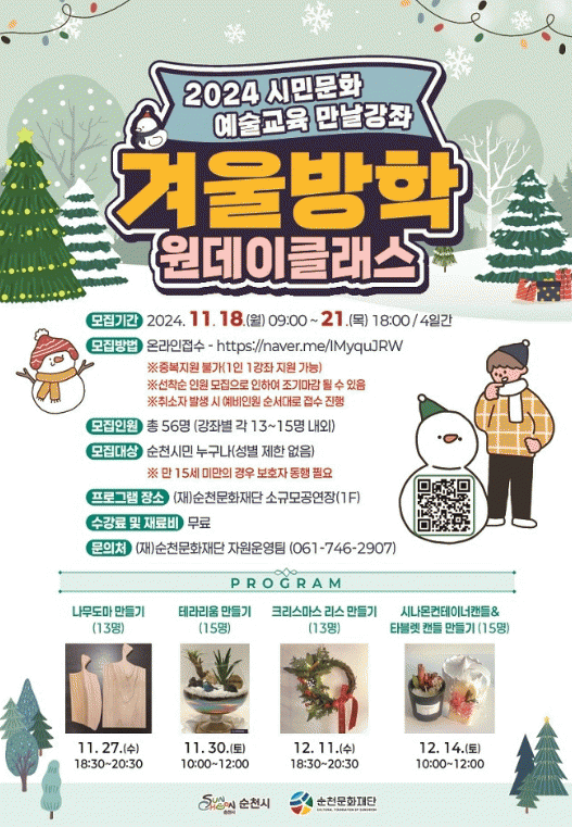 (재)순천문화재단 시민문화예술교육 만날강좌 원데이클래스 프로그램 「겨울방학」의 자세한 내용은 순천문화재단 누리집을 통해 확인 가능하다.