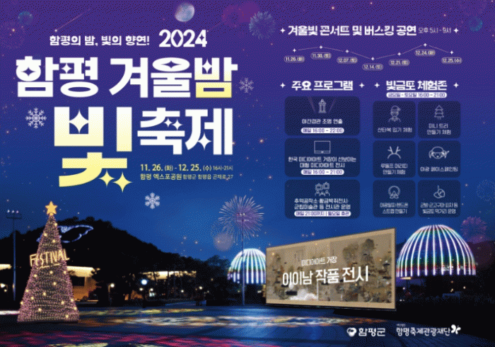 ‘2024 함평 겨울빛축제’는 함평엑스포공원에서 11월 26일부터 12월 25일까지 열리며, 겨울밤을 따뜻하게 밝힐 다채로운 빛 조형물과 함께 함평을 찾는 관광객들에게 특별한 겨울의 추억을 선사할 예정이다.