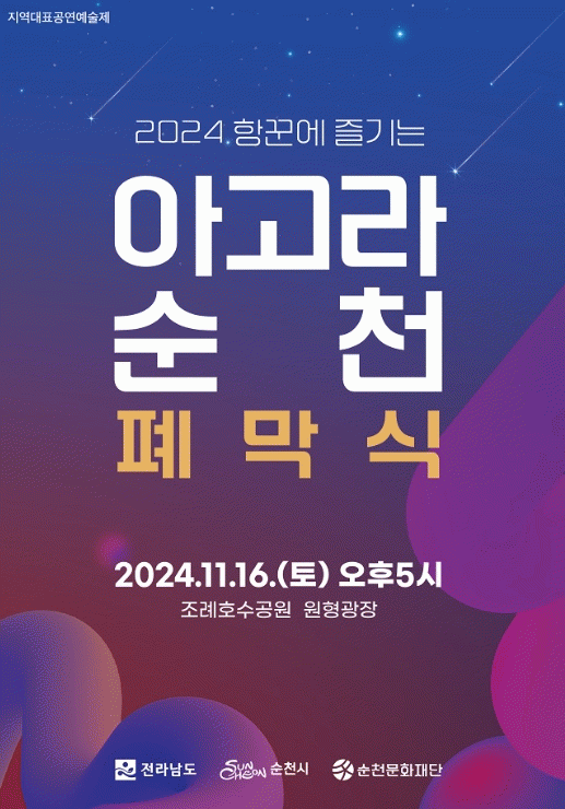 이번 폐막식은 타악 퍼포먼스 그룹 잼스틱의 사전 공연을 시작으로 2024 아고라 순천 활동 영상 상영, 우수예술가 폐막공연 순으로 진행되며 마지막 피날레 공연을 통해 올해 대장정의 마지막을 장식할 예정이다.